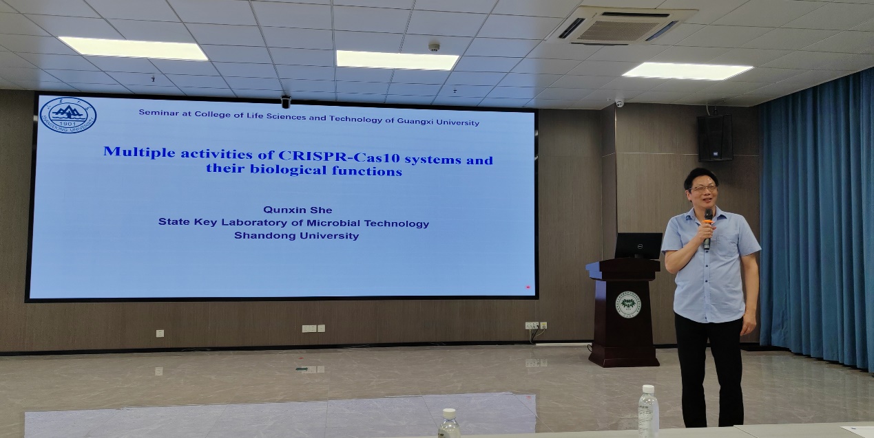 9月17日下午,广西大学beats365亚洲版成功举办了第十期“生命科学君武讲坛”。山东大学特聘教授佘群新受邀,作了题为“CRISPR-Cas10系统的多重免疫活性及其生物学功能研究”的学术报告,吸引了广大师生的参与。报告会由何正国院长主持。