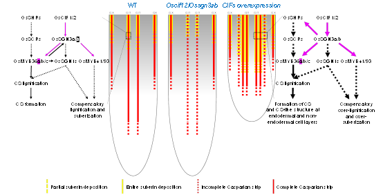 该研究发现在水稻基因组中含有三个编码CIF小肽基因(OsCIF1a、OsCIF 1b、OsCIF2)和两个编码类受体激酶SGN3基因(OsSGN3a、OsSGN3b)。OsCIFs主要积累在中柱中,而OsSGN3s特异性定位于内皮层凯氏带区。同时突变三个OsCIFs或两个OsSGN3s都导致内皮层产生不完整的凯氏带,同时异位的木质素和木栓质在内皮层累积也显著减少。与此相反,异位过表达OsCIF1或OsCIF2能够在邻近内皮层的多层皮层细胞诱导出完整凯氏带结构以及细胞层的过度木质化和木栓化(图1,2)。并且,同时过表达OsCIF1和OsSHR1能够诱导更多细胞层产生凯氏带结构(图1)。转录组分析进一步发现了112个受OsCIF1/2-OsSGN3信号调控的下游基因,包括控制凯氏带和木栓层形成的一些关键基因,例如OsMYB36a、OsCASP1、OsMYB41/93(图2)。另一方面,OsMYB36a/b/c能够调控OsSGN3b和OsSGN1s的表达水平(图2)。此外,在过表达OsCIFs植株中,OsSHR1、OsSHR2以及OsSCRs等凯氏带形成的关键调控基因表达量也显著增加。这些结果说明OsCIF1/2-OsSGN3a/b信号通路与转录因子OsSHR-OsSCR-OsMYB36a/b/c调控网络协同控制或诱导水稻根中内皮层和非内皮层凯氏带的形成(图2)。本研究不仅完善了水稻内皮层凯氏带形成的基因调控网络,而且为未来利用CIF信号途径在其他非内皮层细胞间构建凯氏带结构来调控植物对养分的选择性吸收提供了重要的理论参考。