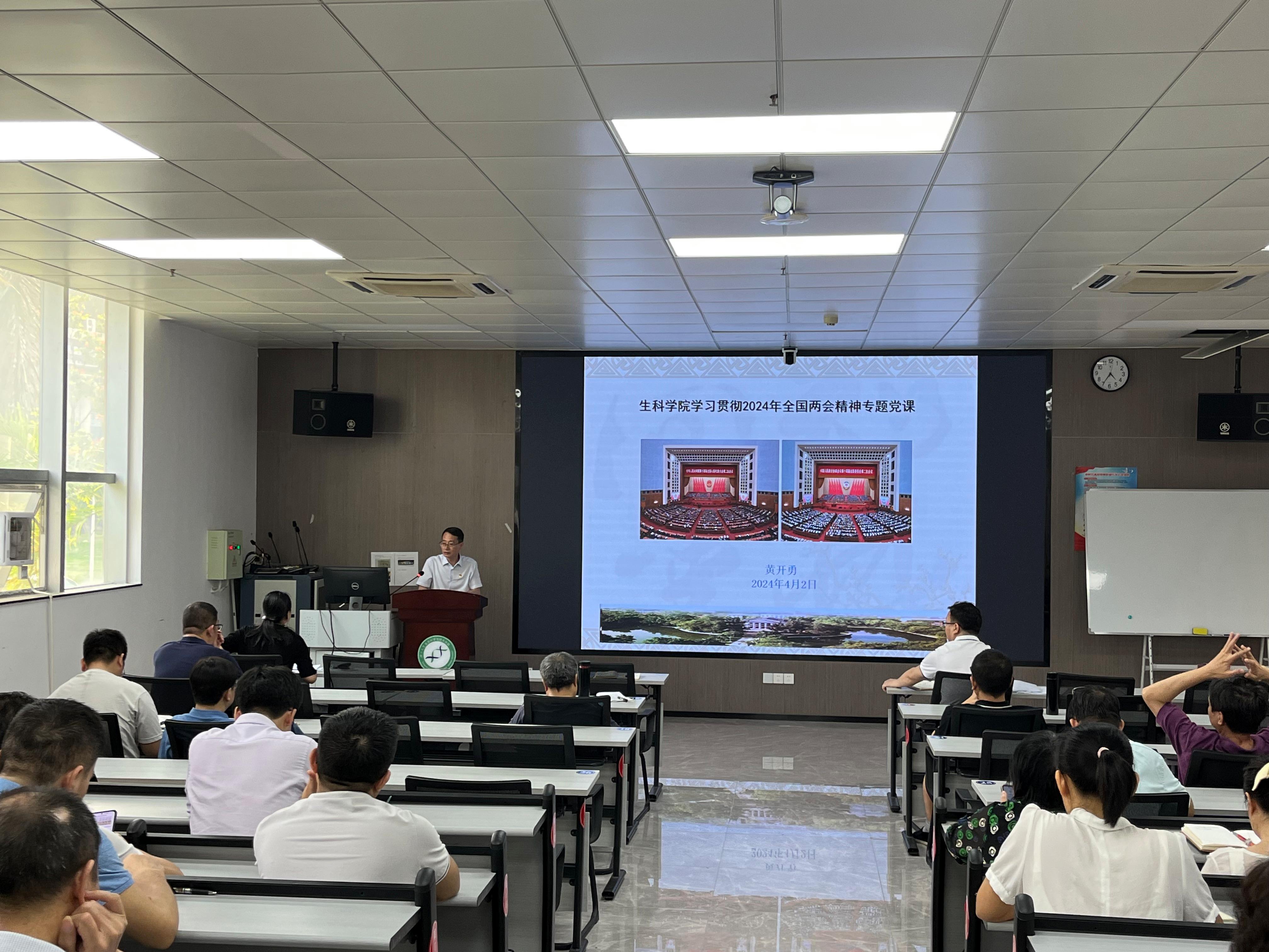 4月2日,我院在106室举办学习贯彻2024年全国两会精神专题党课。学院党委书记黄开勇主讲专题党课。