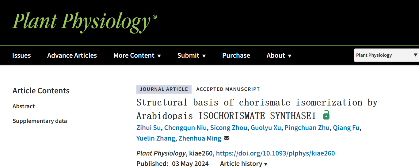 近日,我院明振华课题组在Plant Physiology上发表题为“Structural basis of chorismate isomerization by Arabidopsis ISOCHORISMATE SYNTHASE1”的研究论文,揭示了拟南芥异分支酸合酶ICS1催化分支酸异构化的结构及催化机制。