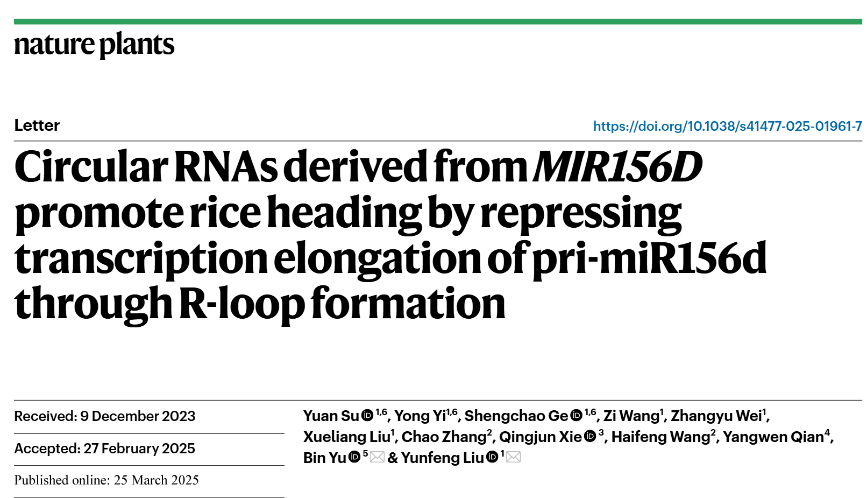 近日,我院刘云峰教授团队在环形RNA调控水稻开花领域取得新进展,相关研究成果以“The circularRNAs derived from MIR156D promote rice heading by repressing transcription elongation of pri-miR156d through R-loop formation”为题,发表在Nature子刊Nature Plants上。该论文的共同第一作者为广西大学beats365亚洲版苏元副教授、2021级生物学博士生易勇和葛盛超副教授,通讯作者为我院刘云峰教授和美国内布拉斯加大学林肯分校于彬教授。广西大学为论文第一完成单位。
