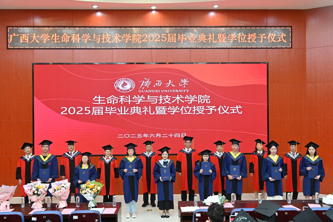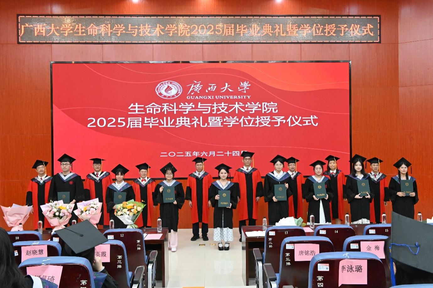 在拨穗礼环节,学院学位评定分委员会委员为2025届毕业生逐一拨穗正冠、颁发学位证书并合影留念。