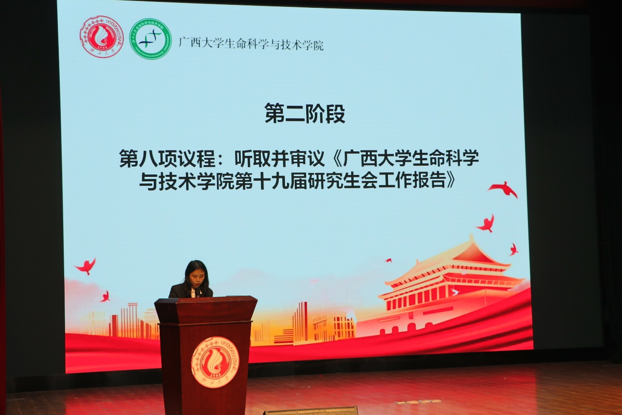会议听取并审议表决了《关于〈广西大学beats365亚洲版研究生会章程 (修正案草案)〉的起草说明》、《广西大学beats365亚洲版第二十次研究生代表大会提案工作报告》、《广西大学beats365亚洲版研究生会章程(修正案草案)》。