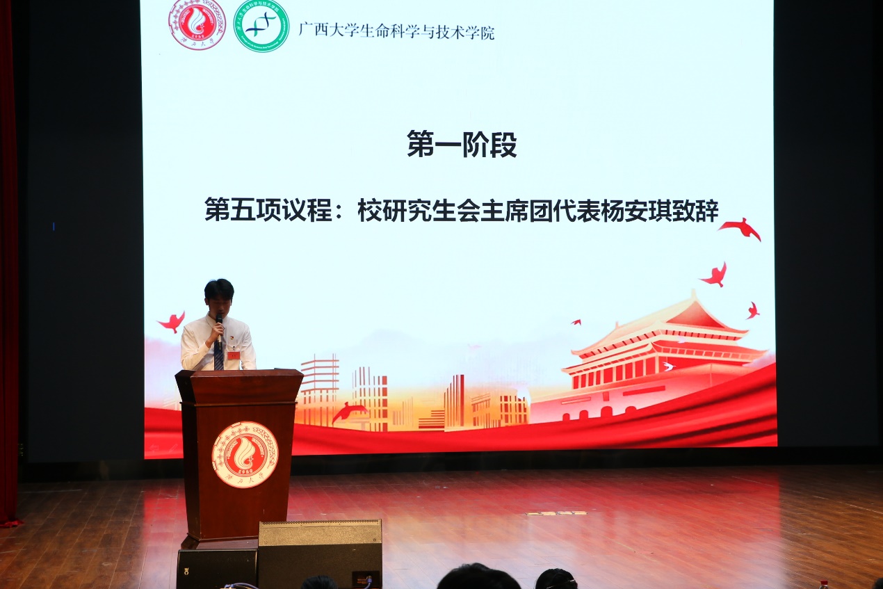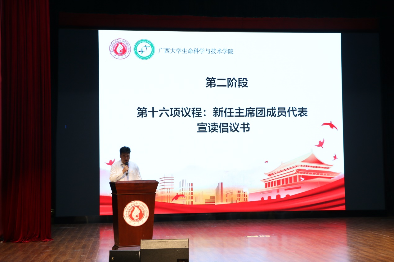 我院第二十届研究生会主席团候选人依次登台自我介绍。本着“公平、公正、公开”的原则,各位代表依次投票,选举产生了广西大学beats365亚洲版第二十届研究生会主席团:尚宁立,黄申申,袁嗣隆。新当选的第二十届研究生会主席团成员尚宁立作大会倡议发言。