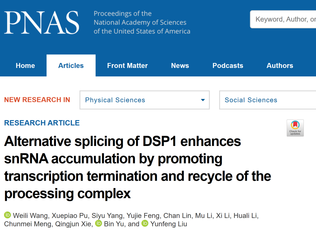 广西大学生科院刘云峰课题组于2020年8月,在国际著名学术期刊PNAS(PROCEEDINGS OF THE NATIONAL ACADEMY OF SCIENCES OF THE UNITED STATES OF AMERICA, IF5Y=9.516)上在线发表了题为“Alternative splicing of DSP1 enhances snRNA accumulation by promoting transcription termination and recycle of the processing complex”的研究论文,揭示了植物中snRNA积累的空间调控机制。