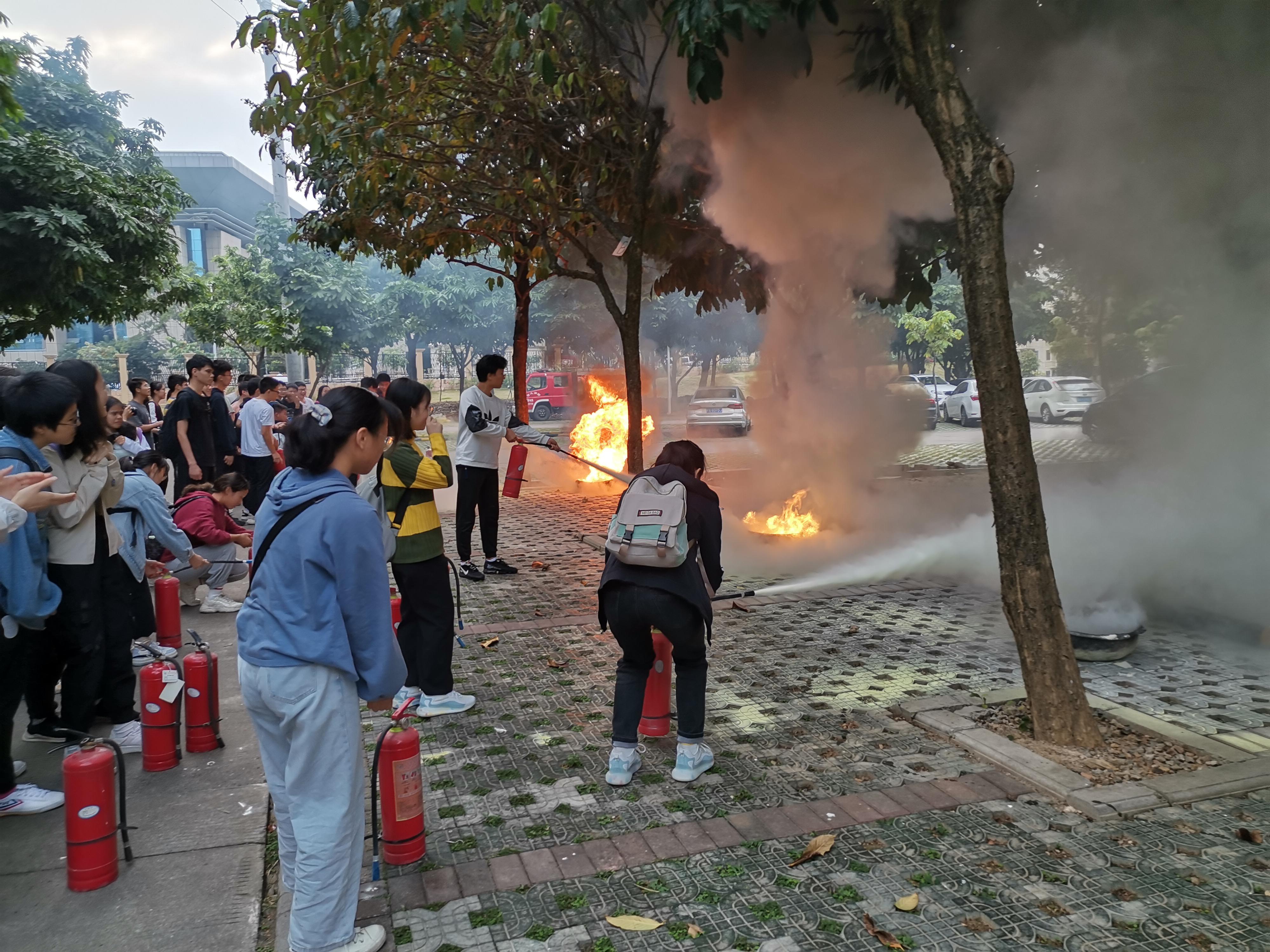 演示完毕后,消防员分发灭火器,让同学们亲自实践。在认真听讲及观摩后,同学们也迫不及待想要尝试。在消防员的指导下,每位同学都成功将火扑灭。通过此次消防演练,新生增强了消防意识,掌握了基本的消防知识,提高了面对突发情况时应对险情的能力。