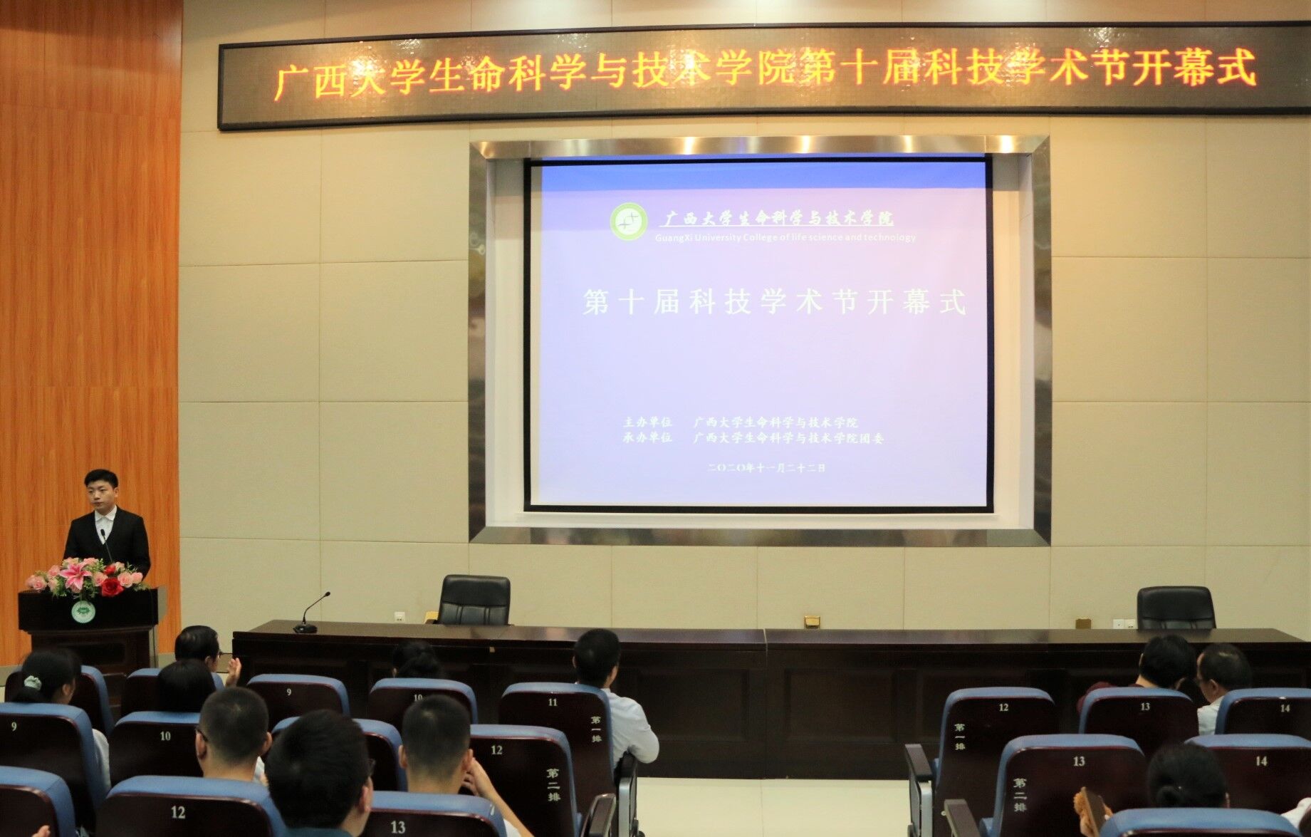为深入学习贯彻党的十九届五中全会精神,进一步培养广大青年学生的科学精神、创新意识,在我院形成崇尚科学、追求创新的浓厚氛围,构建大学生科技创新活动体系,我院于2020年11月22日上午8点在学院圆形报告厅隆重举行学院第十届科技学术节开幕式。科技学术节是学院精心打造的一个特色品牌学生活动,参与面覆盖全院学生。从2011年举办至今,已经举办了十届,是深受生科学子喜欢的第二课堂活动。本次科技学术节,以“营造学术氛围,提升科技素质,培养创新人才”为主题,以实验技能大赛为龙头,举办技能竞赛、学术论坛、知识普及、经验分享、行业调研等5大类11项活动。