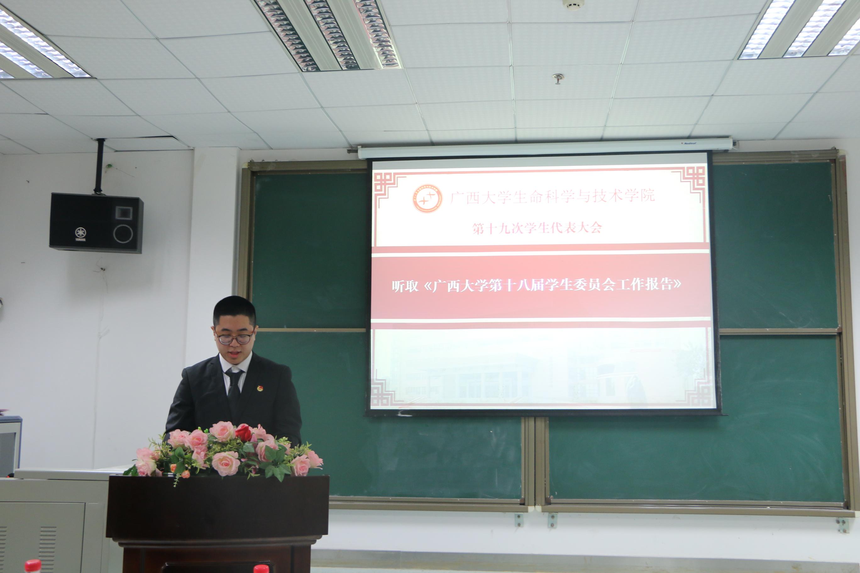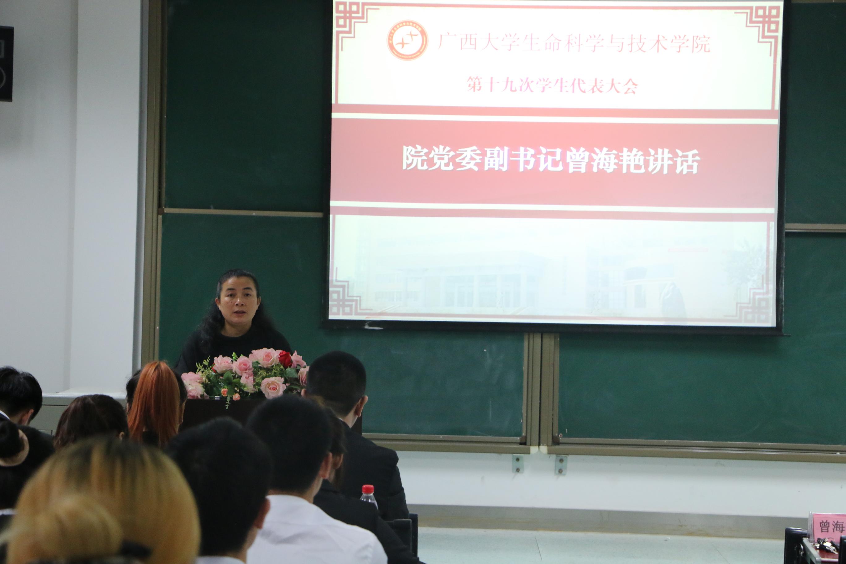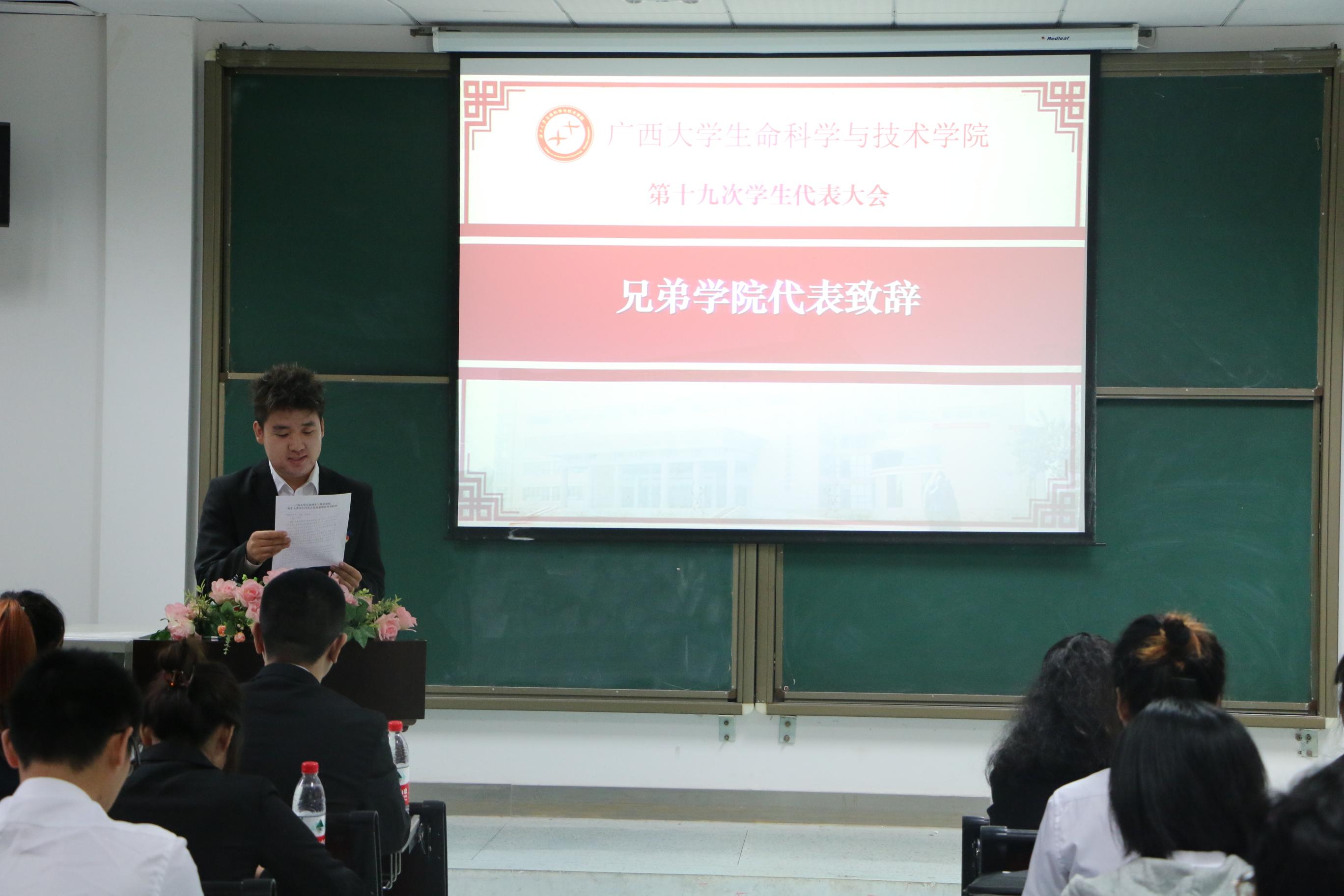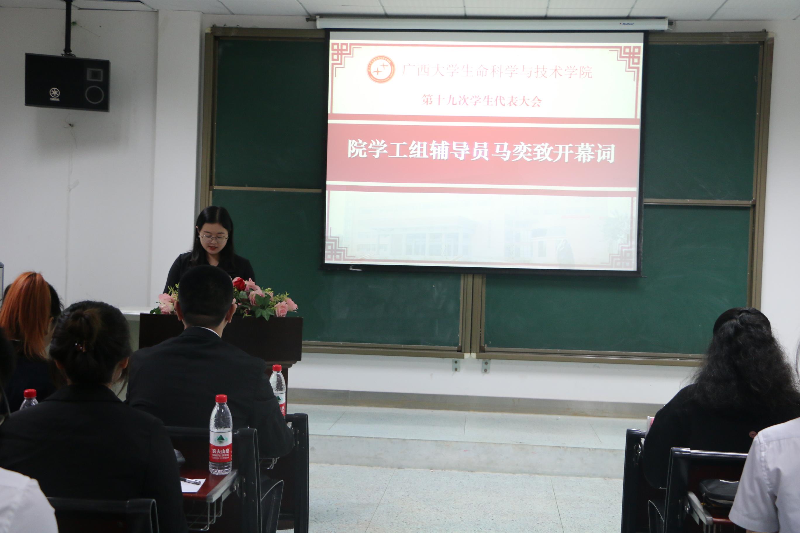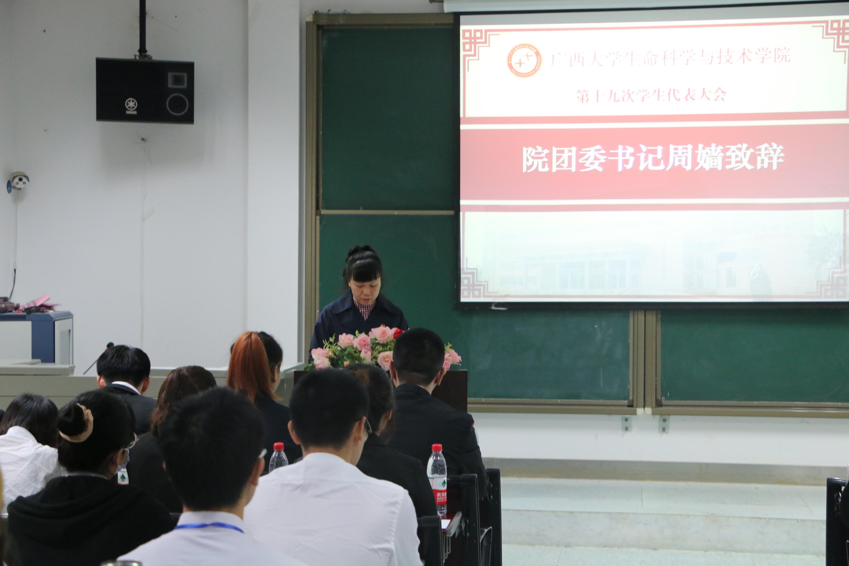随后,院团委书记周嫱老师致辞,周老师对我院第十八届学生会锐意进取、改革创新, 团结带领我院学生为广西大学建成一流大学的各项工作做出肯定;并提出了本次大会的意义与宗旨,希望各位学生代表能切实履行自己的职责,正确行使自己的权利,希望新一届的主席团成员能够“承前启后,继往开来”,在接下来的工作中再创辉煌。