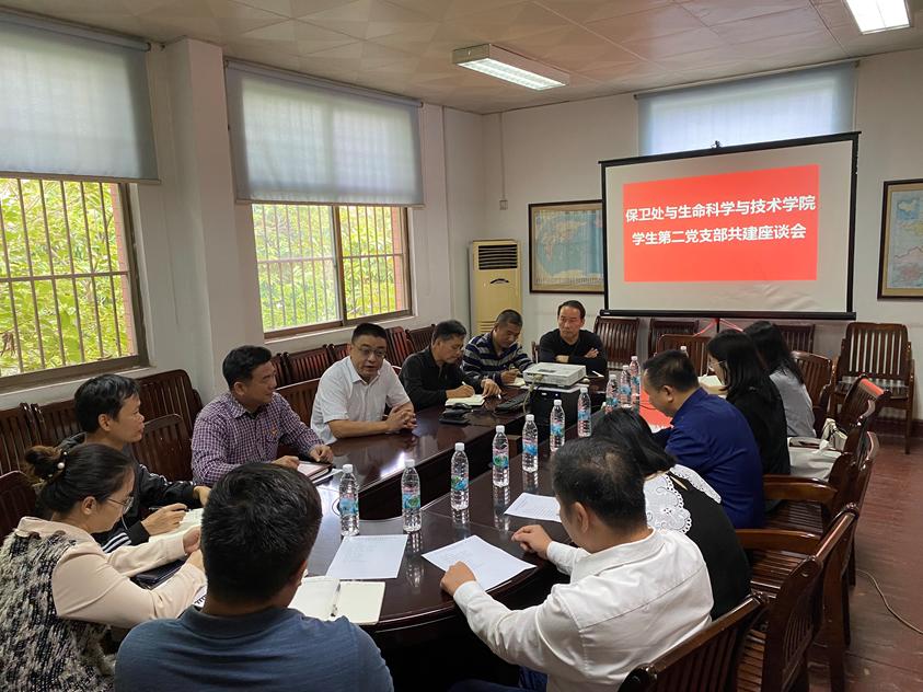 为扎实推进党史学习教育,促进党支部间工作经验交流,增强基层党组织的凝聚力和战斗力,10月15日下午,我院生物技术第二党支部与校保卫处在保卫处二楼会议室举行支部共建座谈会。保卫处副处长侯泽、保卫处党支部副书记慕朝明、党支部委员代表、岗位责任人参加了活动座谈,我院党委书记莫柏林、党委委员龙晓鹏以及本科生生物技术第二党支部学生党员代表参加了此次活动。本次座谈会由慕朝明主持。