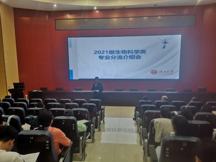 为促进学生学业发展,扎实做好2021级学生专业分流工作,3月7日,我院在国家重点实验室圆形报告厅举行2021级生物科学类专业分流介绍会。学院副院长李伟辉教授、生物科学专业负责人唐东阶研究员、生物技术专业负责人刘云峰教授、李楠副教授、玉延华副教授、秦秀林副教授、俸雪辅导员等出席会议,教学秘书莫柏立老师主持会议。